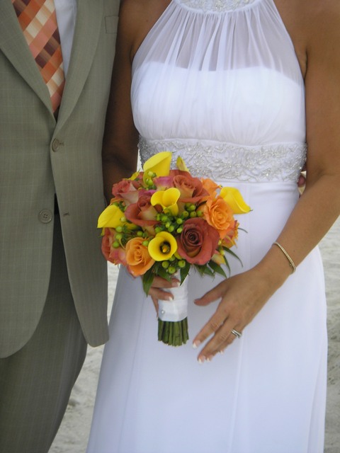 This weekend we had the pleasure of visiting the Grand again - Kristi was our Bride's co-ordinator she was helped later by Cherish and Diana.  Our Bride and Groom - Christine and Ryan were wonderful to work with and we enjoyed our time with them - they live locally in Riverview. Our two Bridesmaids were in beautiful spice colored dresses with a stunning white design which photographed beautifully - our choice of Leonardis and Orange Roses with accents of yellow Mini Calla and green Hypericum Berries really worked magnificently with this color.  The Grand had done lots of work to its south beach ceremony site with all new palms and a new large Bamboo Arch - the Hotel's original Palms were affected by last winter's freeze - the replacements are larger and fuller than the originals and make a wonderful setting - clearly without question the best wedding ceremony site on the Beach from St Pete Beach north. You will see from our photos our weather was typical for a Florida Summers afternoon - cloudy with a chance or rain and quite warm.